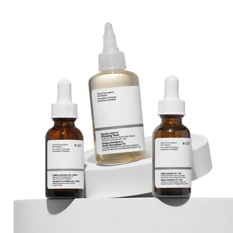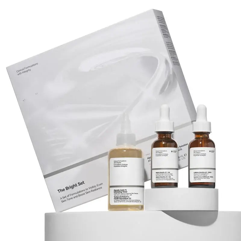 The Bright Set contains three targeted formulations that contain well-studied brightening ingredients to help visibly target uneven skin tone, while brightening dull skin.